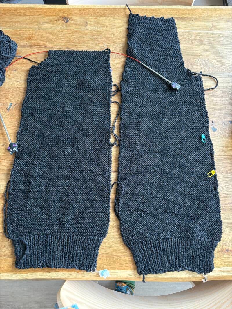 Het streven is om het vest voor het einde van de maand af te hebben. Dan kan hij lekker gedragen worden, zelfs als jas wanneer het straks langzaam weer warmer wordt buiten.